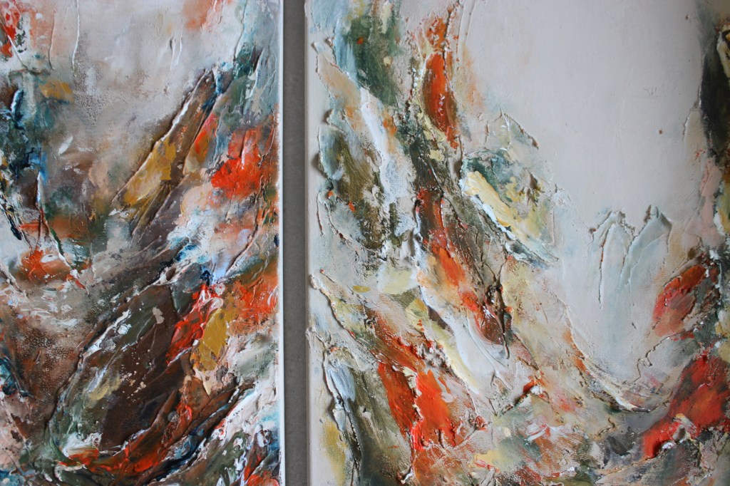 Teokset ovat akryylivärein ja sekatekniikoin toteutettuja maalauksia. Teokset toimitetaan ripustusvalmiina, suojalakattuina ja signeerattuina. Kaikissa teoksissa on viimeistellyt reunat, riippuen teoksesta maalauksen kuva jatkuu reunoille tai reunat on maalattu valkoisiksi. Huomioithan, että teosten värisävyt kuvissa saattavat vaihdella laitteesta riippuen. Lisäkuvia saatavilla pyydettäessä.